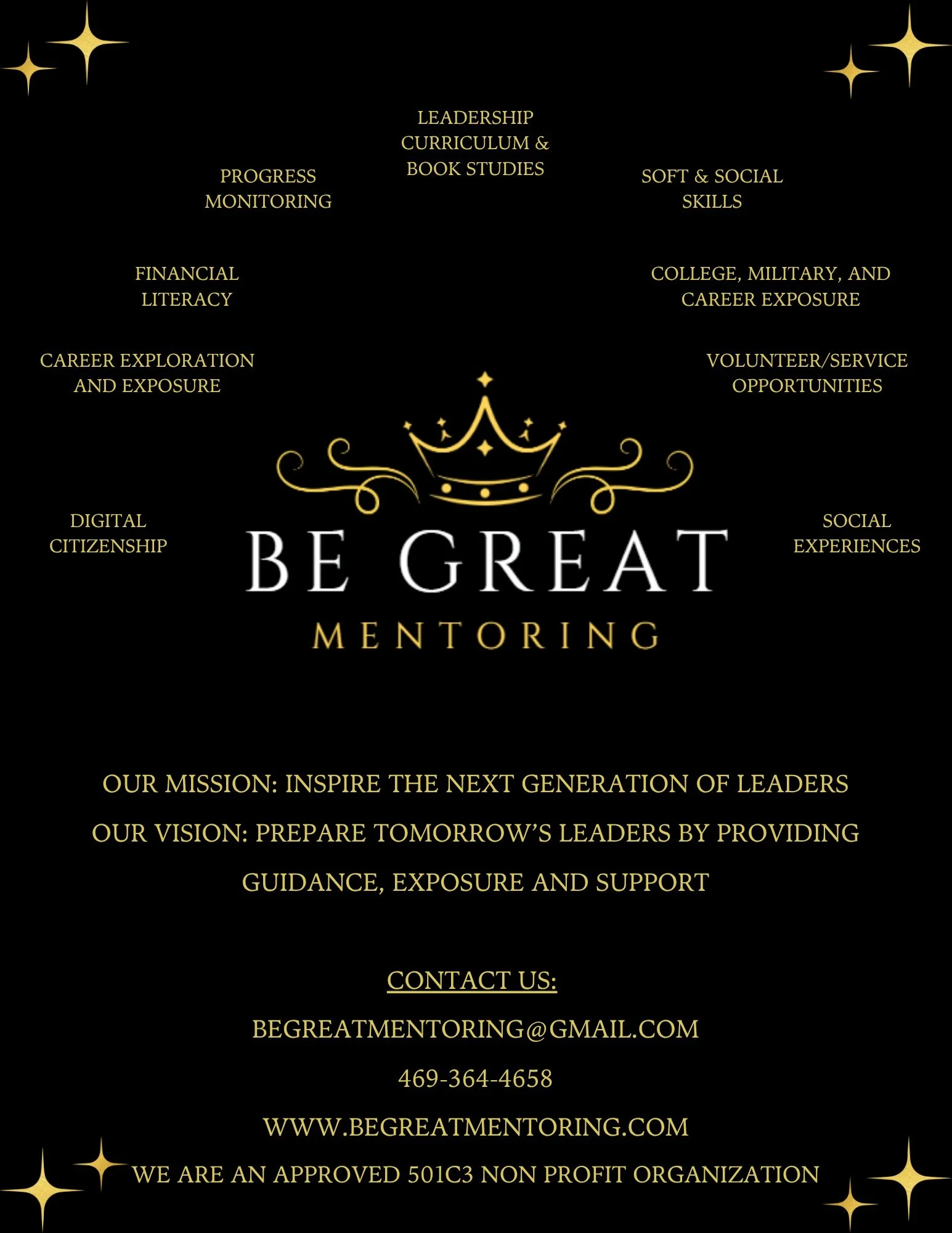 BE GREAT Mentoring is a non profit organization based in McKinney-Frisco area of Texas. Our mission is to prepare the next wave of great leaders. We help our mentees curate a vision for their lives and develop a plan & process to make it happen. Our vision is to ensure our mentees are equipped with the necessary tools and mindset to not only survive but to also thrive in the 21st Century.